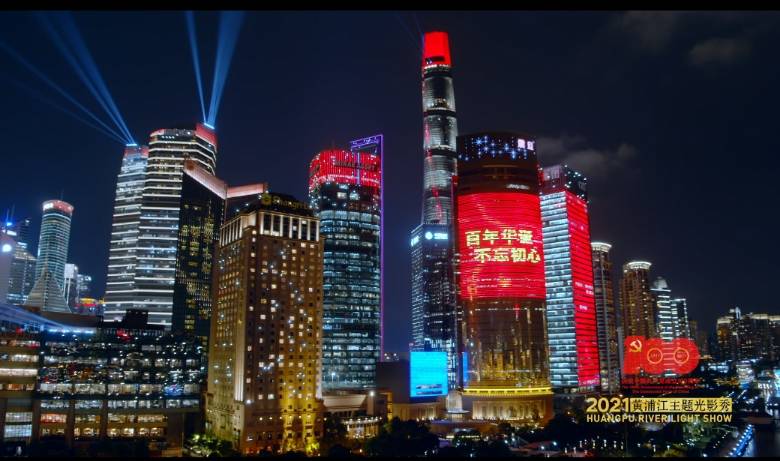 “永远跟党走” 主题光影秀以黄浦江两岸300余栋楼宇的景观灯光为基础,辅以激光灯、光束灯、灯光艺术标识和量身定制的配乐,通过艺术编排,两岸呼应、地空联动、声光同步,色彩斑斓。