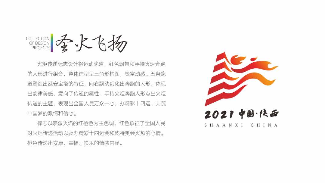 设计理念:火炬设计方案取象于飘扬的红旗,取名“旗帜”,寓意在中国共产党的领导下中国发生翻天覆地的变化,党和国家在各方面取得辉煌的成就。火炬上部分设计层次丰富、具有张力、动感十足。分层采用金色包边,具有富贵和吉祥的寓意,寄托了我们对于本届全运会的美好祝福。出火口设计灵感源于山丹丹花,又名红百合,具有“百年好合”之美好寓意,是山丹丹花的艺术化剪影形态的表现,具有浓郁的陕西地域文化特点,也表达出我们对建党百年最好的祝愿。十四运会和残特奥会使用一个火炬,同时出现两个会徽,意为“两个全运 同样精彩”。手柄部分采用白色,红色和白色对比强烈,色彩视觉效果突出,非常醒目,背面有火炬传递标识——圣火飞扬。