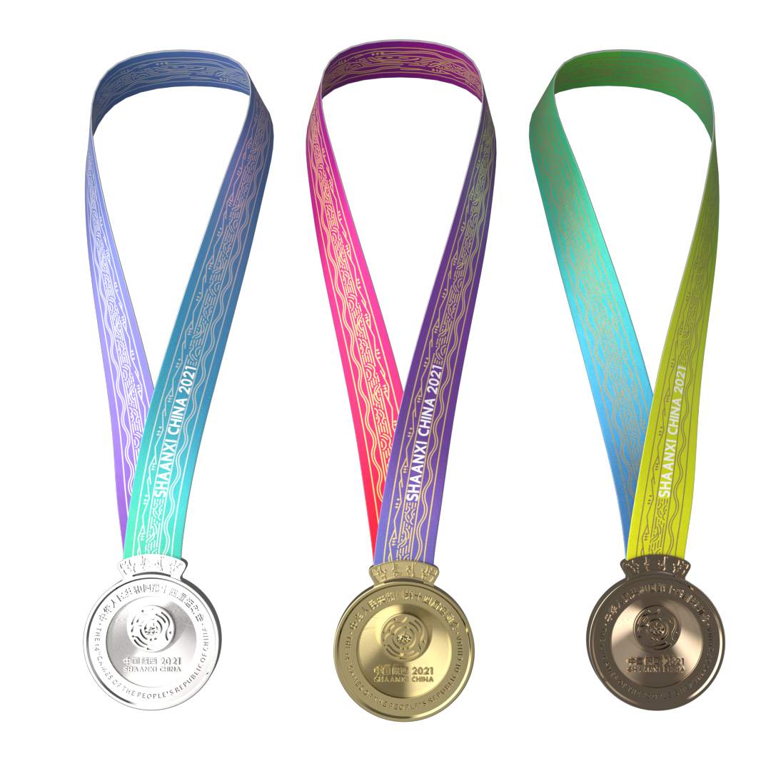 设计理念:奖牌设计正面用会徽作为主元素,周围环绕“第十四届全国运动会”中英文标准字。奖牌背面运用浮雕工艺将秦岭四宝吉祥物形象与秦岭山脉结合,背面最上方环绕了主题口号“全民全运,同心同行”字样。绶带图样采用核心辅助图形,色彩配合奖牌颜色分别选取了标准色中的三段。连接奖牌与绶带的卡扣设计提取了国宝文物和尊上“中国”纹样。整体设计简约、大气庄重,体现出全运会办赛理念和陕西深厚的文化历史底蕴。