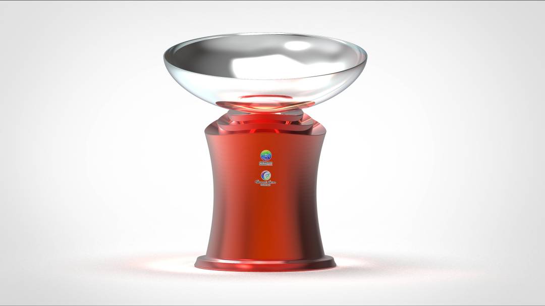 设计理念:奖杯的造型设计源于丝路精神,在设计语言中以三条起伏、层叠的丝绸作为原形,通过对其形态的自然弯曲,形成三个“S”形的样式,予以表达丝路的概念与陕西为举办地的象征性意义。奖杯顶部飘洒的丝绸与底部环绕聚合的形态传达出“开放包容”的理念,整体形态犹如绽放的花朵,富有美感。在设计细节与原形的意向表达中,奖杯的设计参考到波涛的黄河与连绵的秦岭山曲线,象征自然与和平,寓意自强不息、追赶超越的体育精神。奖杯的杯身上下造型视觉差异较大,顶部的形态自然又富有变化,底部的形态简约且稳重,三条丝绸互绕至五层圆台之上,有聚合的意思。五层圆环的叠加又代表运动精神,寓意表达——“汇聚陕西,全民同运”的设计主题。