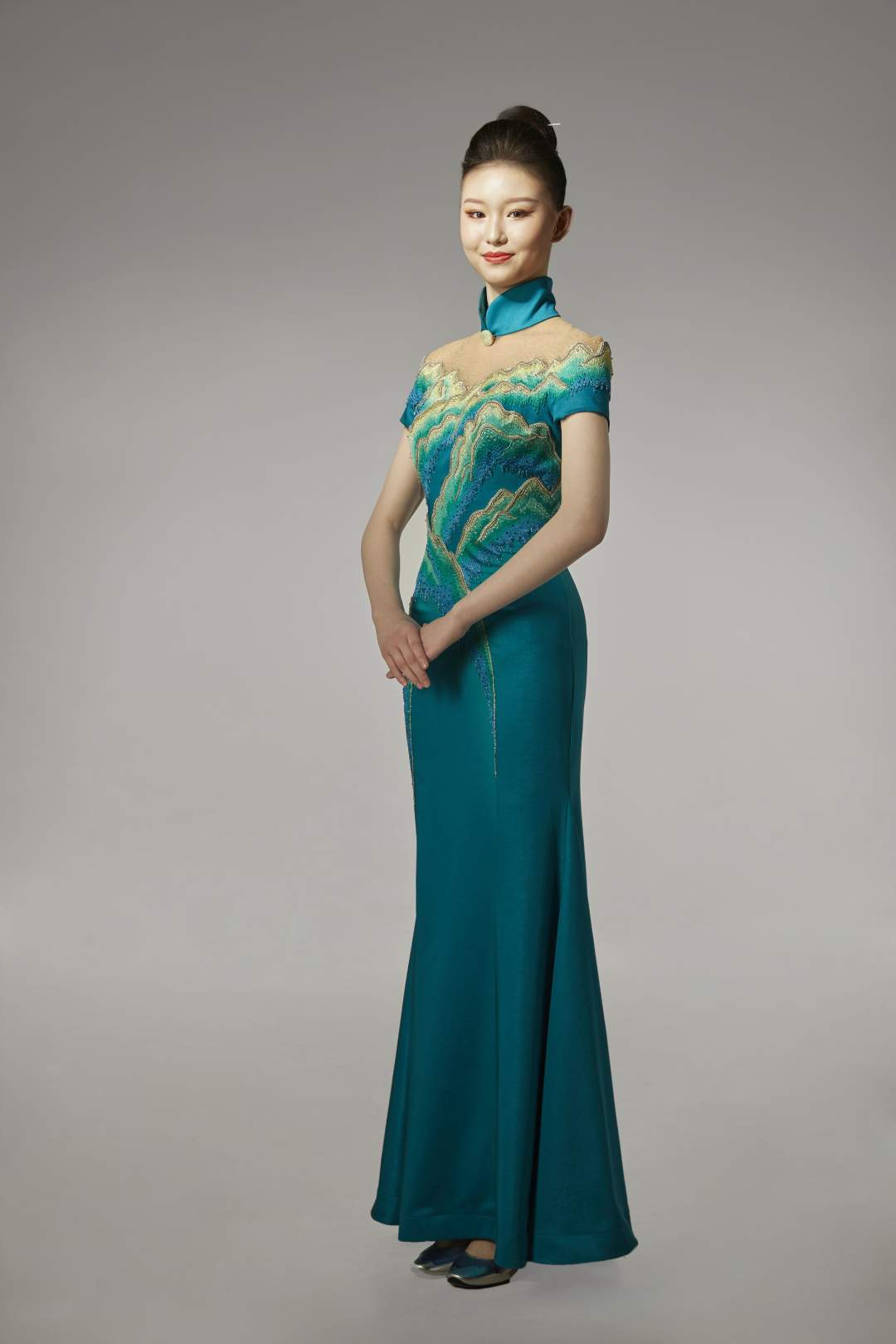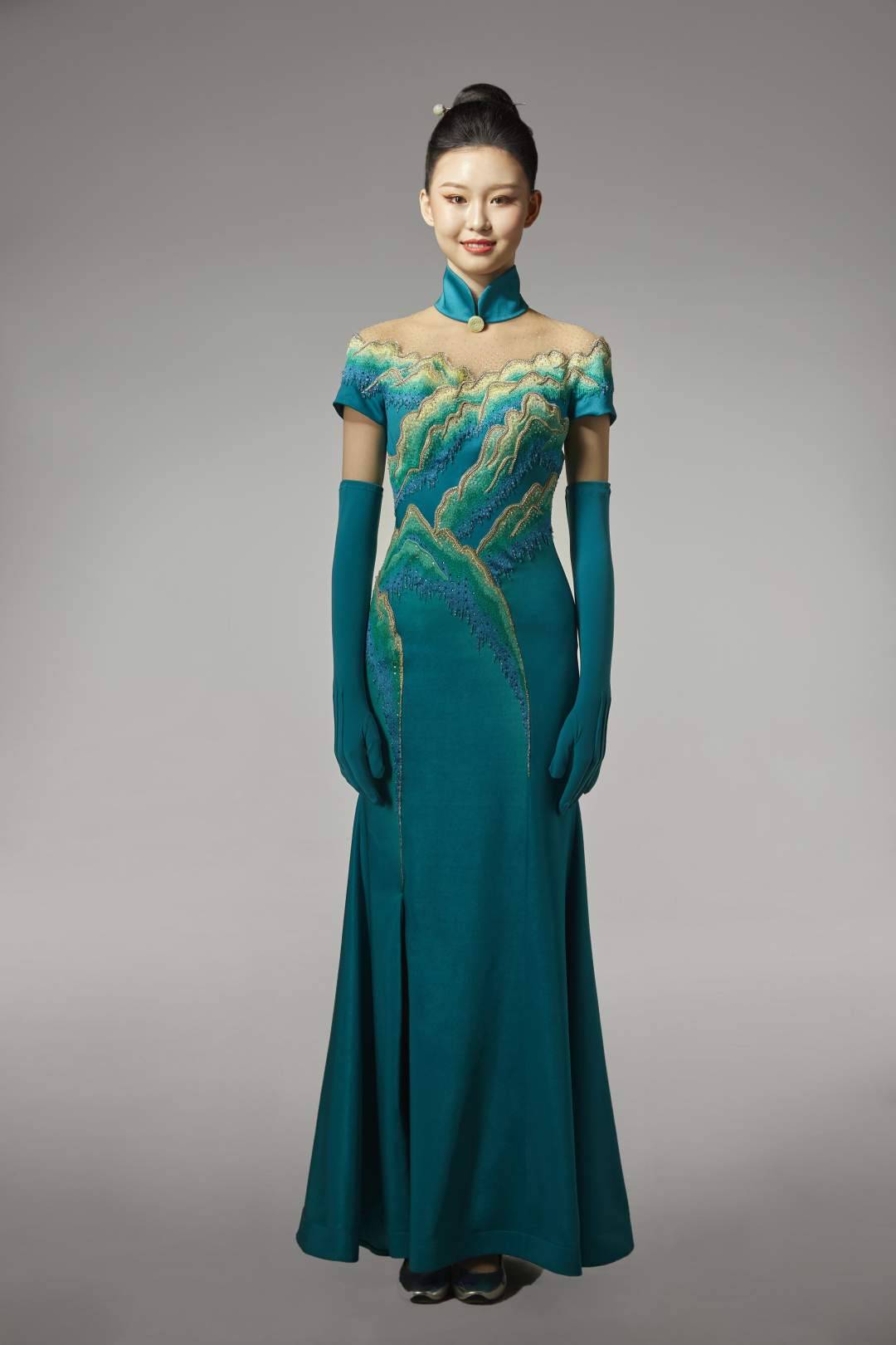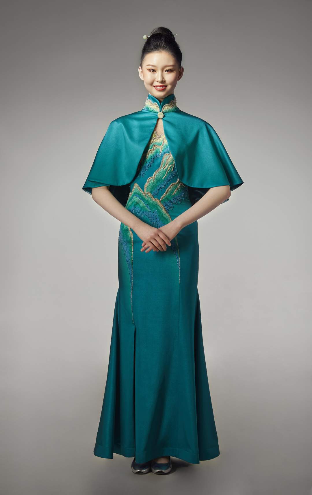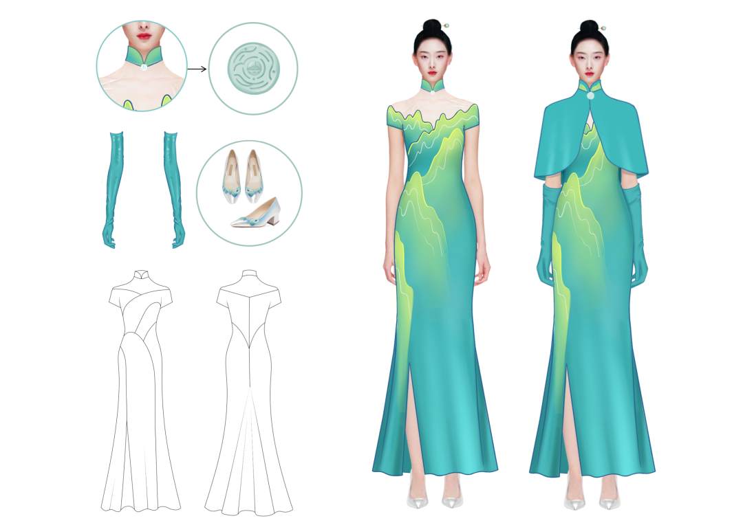 该服装以体现金碧山水的绿色为主色调,款式中西合璧,对传统旗袍的创新演绎,将玉文化贯穿设计,君子比德于玉,寓意运动员守德诚信,金碧的山岭映衬“绿水青山就是金山银山”,寓意人与自然和谐发展,小立领与开叉的设计更显女性婀娜多姿的身段与恬静的气质,采用玉质纽扣,装饰于中式立领间,玉质发簪横贯发髻,寓意守正庄严。设计外搭披肩,整体服装更加端庄柔美。