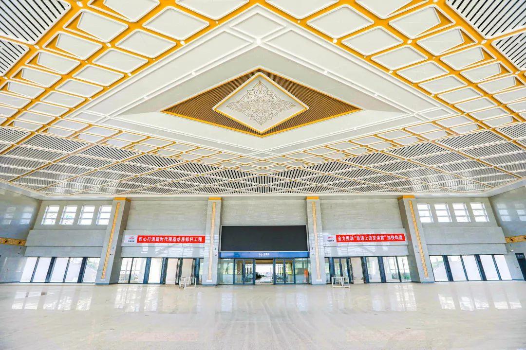 站房设计融入当地文化元素,站房立面、室内吊顶、风口造型的纹饰,均以安次区的河北省非物质文化遗产第什里风筝为设计灵感。