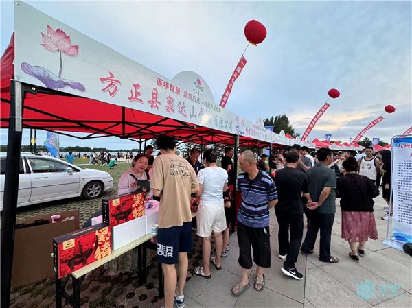 28日下午,方正湖畔游人如织,人声鼎沸,县域居民和八方来客,携家带口地沿湖边跑道漫步,边欣赏莲花美景,边前往开幕式举办地——和谐广场。18时许,开幕式还未开始,但广场上已经挤满了人,莲花节舞台大屏幕播放着《方正欢迎您》短片,来自当地的摇滚乐队正在激情演唱,现场气氛十分热烈。舞台下,观众早早占好了位置等待着莲花节开幕。广场四周的方正特色产品集市里,人们游览、品鉴“方正好物”,集市里既有“工程北米”“徐一菲食品”等来自“方正经开区”企业的特色产品,也有清华大学乡村振兴工作站黑龙江方正支队大学生们和方正榫卯传承人带来的“文创好物”,更有“得莫利炖鱼”、特色坑烤、乡依玉米面条等方正特色美食,琳琅满目,令人目不暇接。