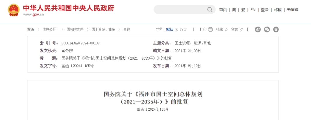 据中国政府网12月12日消息,国务院发布关于《福州市国土空间总体规划(2021—2035年)》的批复。详情↓
