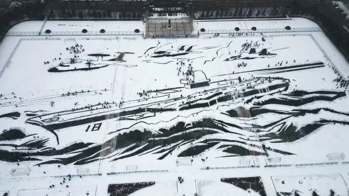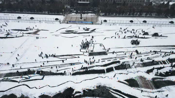 12月28日,哈工程在军工操场举办“热‘雪’铸舰向深蓝,青春共绘强国卷”大思政活动。来自全校18个学院的1200余名师生铲雪塑形,共同“建造”出一艘巨型“福建号”航空母舰雪地图案,以及“空警-600”“歼-35”“歼-15”三架舰载机造型。该活动至今已连续举办七年,成为该校融合劳动教育、专业实践与爱国主义教育的生动载体。