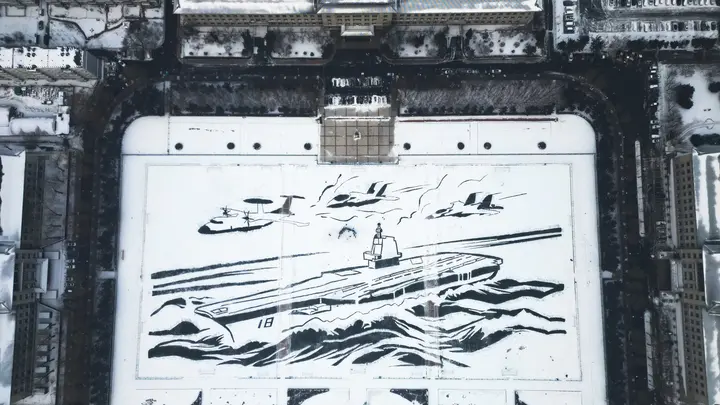 师生们用铁锹和扫帚扫过积雪,让操场的白雪变成国之重器的图案。一个半小时后,当最后一处积雪被清理,230米长、112米宽的军工操场上,一艘线条硬朗、细节精准的“福建号”航空母舰破雪而出;三架舰载机直冲云霄,展现出“雪舰踏浪,机跃云霄”的生动画面。